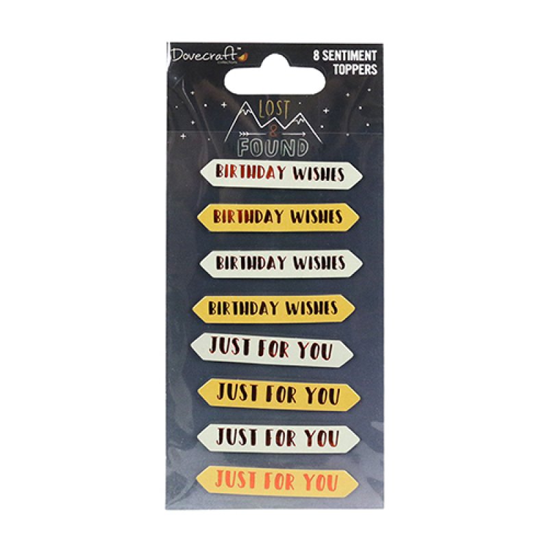 Dovecraft Lost & Found Sentiment Toppers add a personal touch to your projects. In a colour palette of grey and yellow, with rose gold foiling, there are 8 sentiments in a pack, 4 each of 2 designs, with wording "birthday wishes" and "just for you".