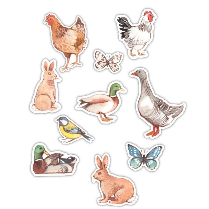 A set of 10 laser cut, printed wooden ephemera shapes, part of the Farm Meadow collection from Craft Consortium. Includes rabbit, mallard duck, bluetit, butterflies and more.
