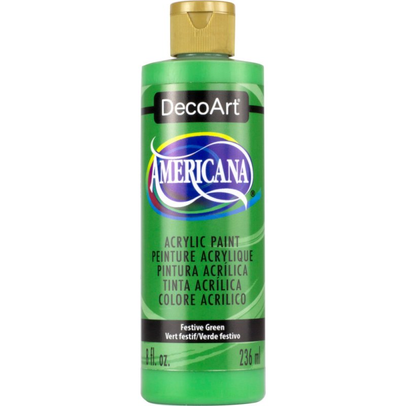 DecoArt Americana Festive Green acrylic paint in a large 8fl oz bottle will deliver superior coverage with a permanent, durable finish and is ideal for professional artists, crafters, and students. Americana Acrylics are water-based and non-toxic and can be varnished to create various sheens. This acrylic paint can be used on almost any surface.