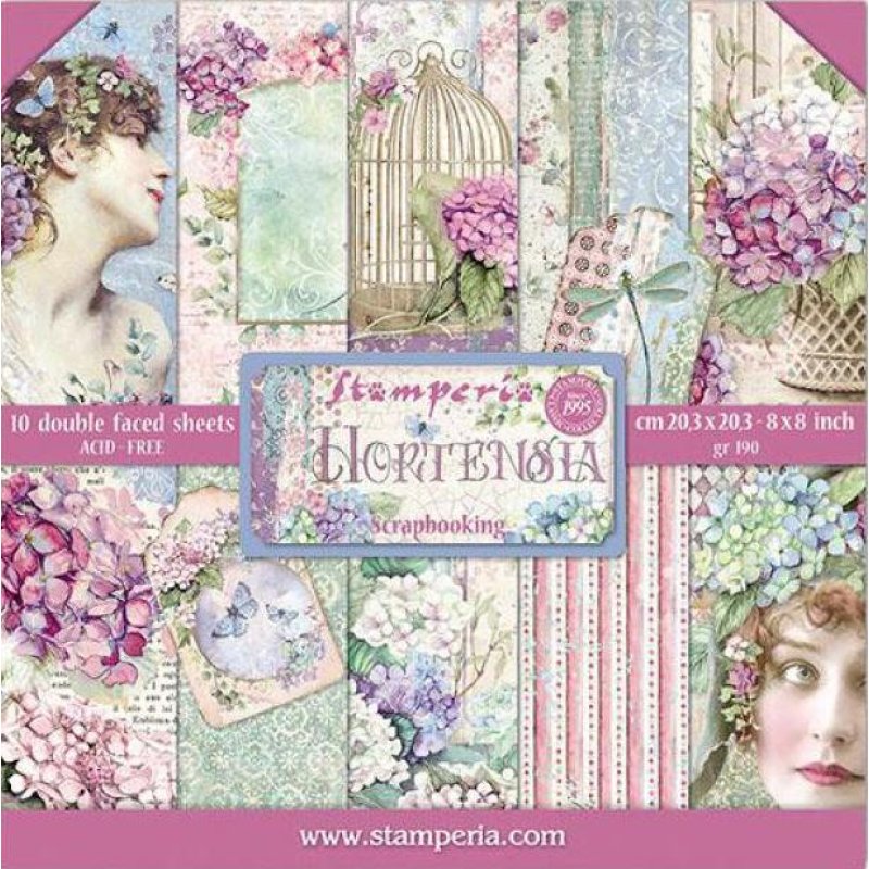 Hortensia 8x8 Paper Pad from Stamperia includes 10 double-sided sheets with designs featuring hydrangeas and ladies that are idea for card making, scrapbooking and more