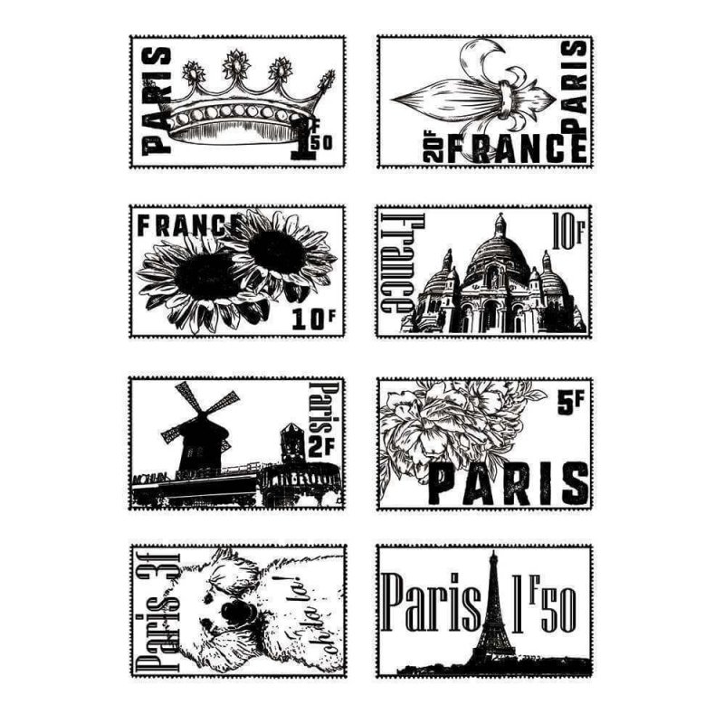 Sara Signature Collection Parisian A6 Acrylic Stamps French Stamps features 8 iconic images of France; ideal for mixed media, scrapbooking & home decor.