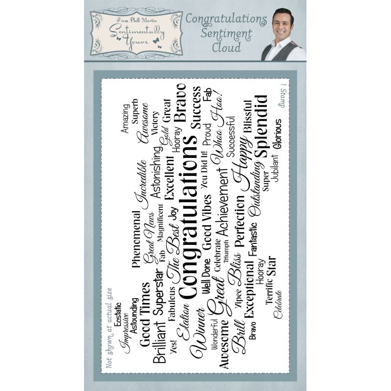Congratulations Sentiment Cloud is part of the Sentimentally Yours collection by Phill Martin. This mounted DL sized rubber stamp features a Congratulations themed word cloud based around the one central word "Congratulations". Great for cards and gifts.