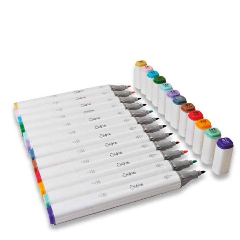 This set of 12 assorted colour permanent pens from Sizzix is a must-have for any crafter's tool kit. Each pen is double ended with a medium-fine tip one end and a medium-broad tip at the other. They can be used on a variety of surfaces including glazed ceramic, glass, acetate and metal.