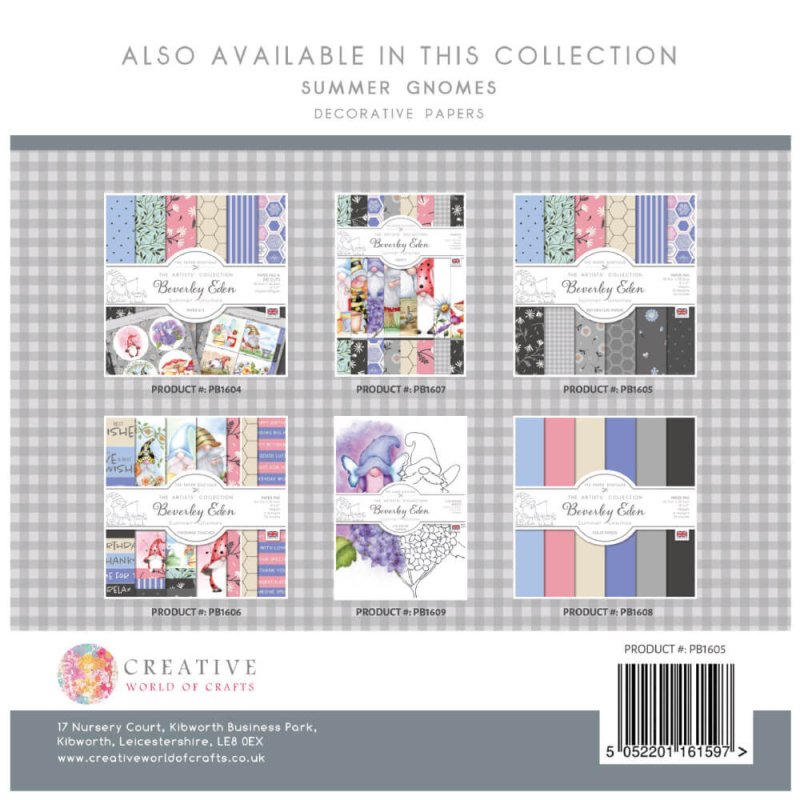 The Artists' Collection Beverley Eden Summer Gnomes Decorative Papers, from The Paper Boutique, is a pad of 36 sheets of patterned papers that are the perfect starting point for card making and other papercraft projects. At a size of 8x8 inches (20.3cm x 20.3cm), they are great for creating backgrounds, border strips and for matting and layering.