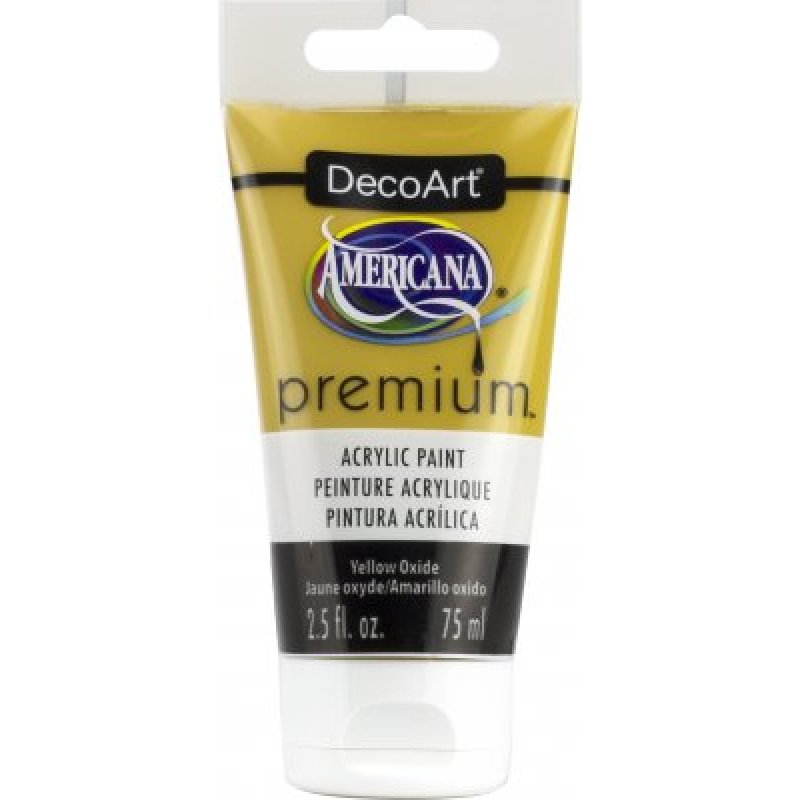 Yellow Oxide premium acrylic paint from DecoArt, with a satin finish, ideal for use on canvas, wood and various other surfaces. In a 2 fl.oz. tube.